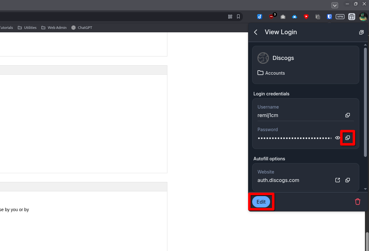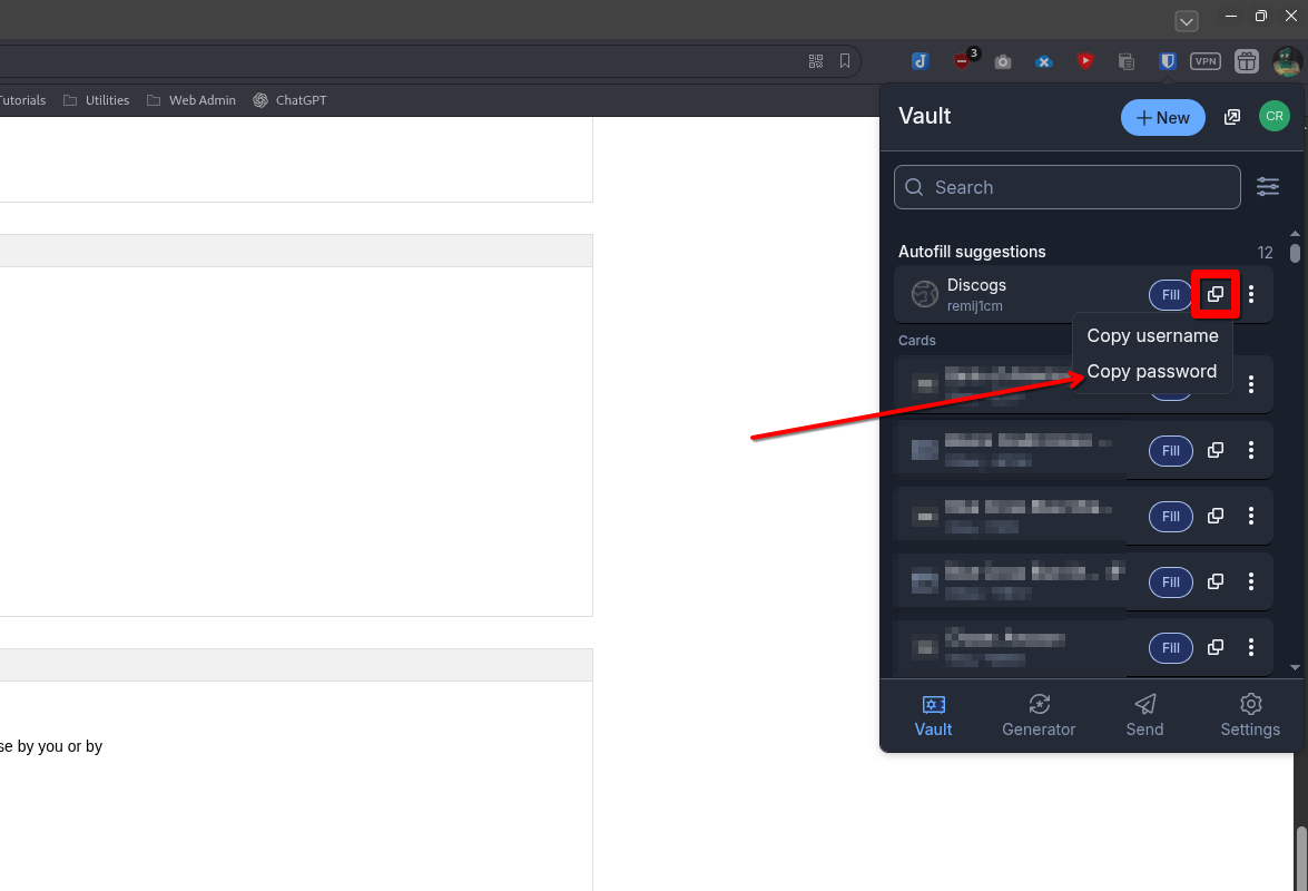 - Now, copy your new password by selecting the Bitwarden extension, finding the right entry, and selecting the "Copy" button: