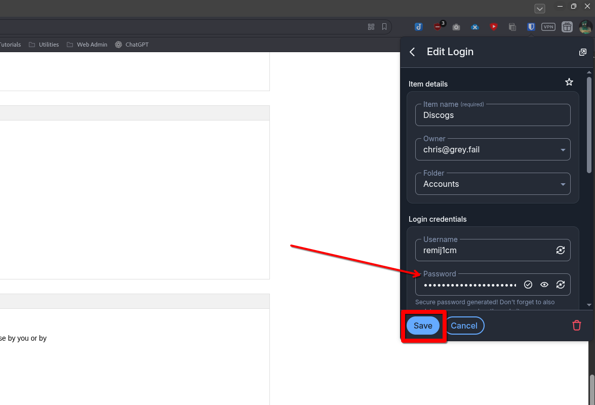 - This will update the Bitwarden entry. You can double check by viewing the password field (toggle the Eyeball button if necessary). Hit "Save":